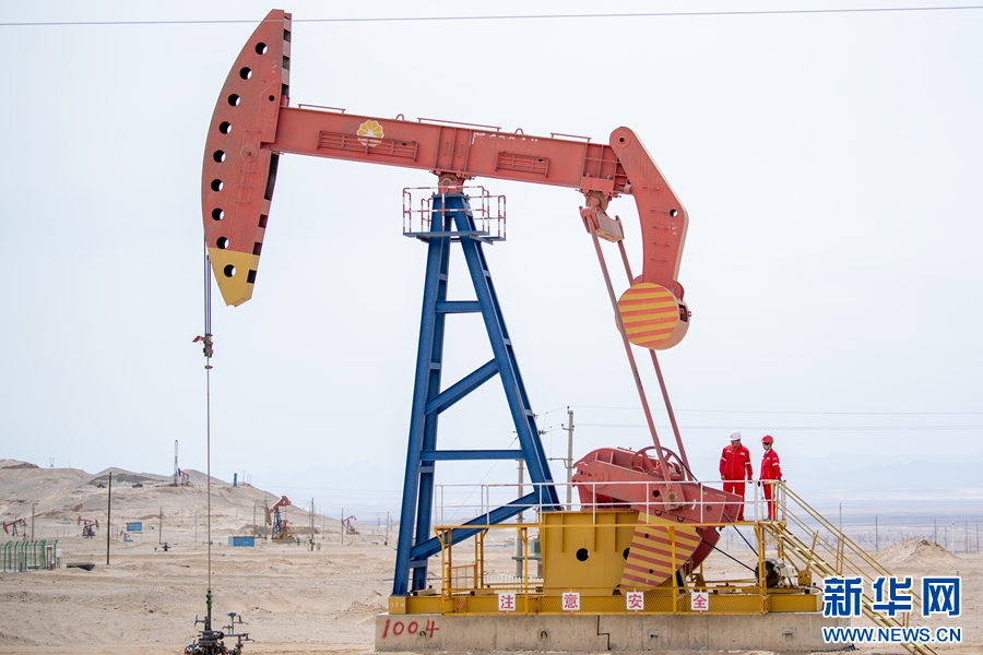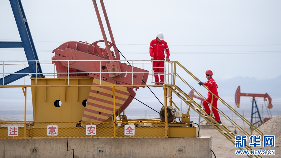 在青海油田采油一厂尕斯运维中心的采油井前,采油工黄群(右)和同事进行设备巡检。