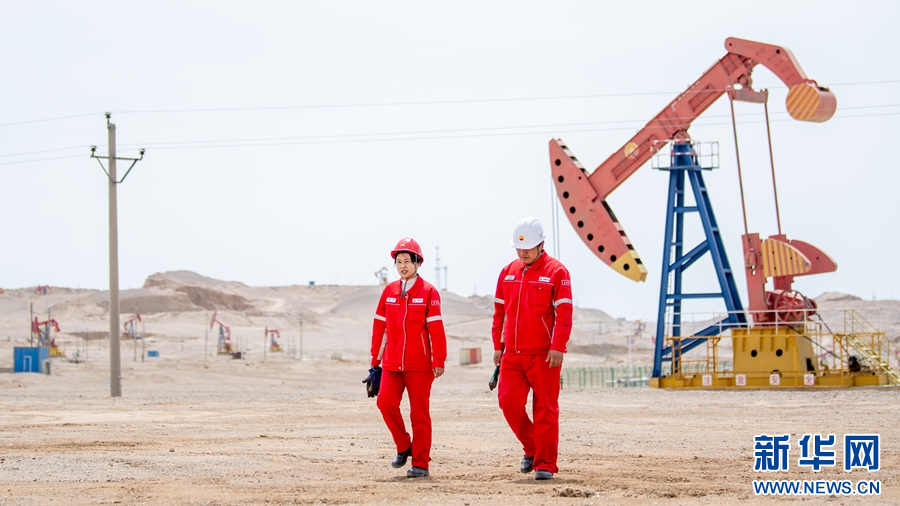 黄群(右)和同事在油井前巡检。