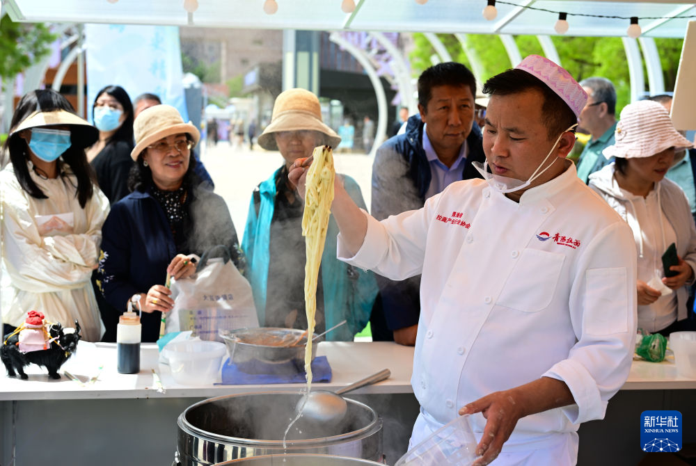 5月19日,在青海文化旅游节特色美食区,工作人员制作青海拉面。新华社记者 齐芷玥 摄