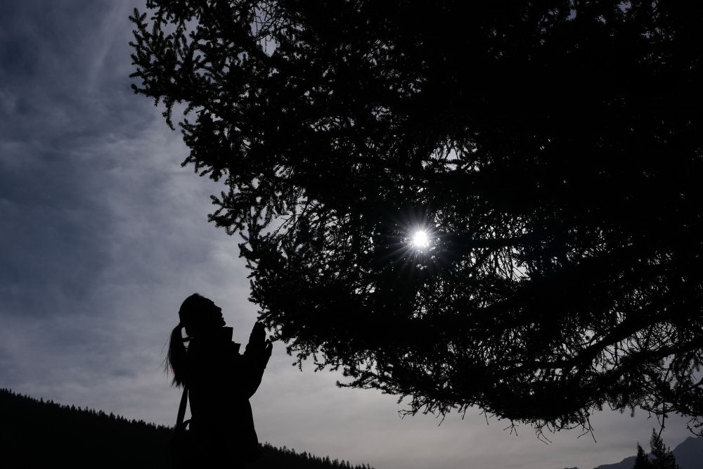 3月6日,祁连山国家公园(候选区)青海片区青阳沟管护站女子管护员张丽萍在查看林木生长情况。 新华社记者 张龙 摄